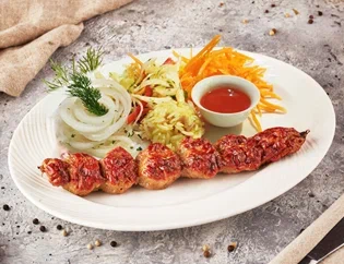 Филе куриное, рис по-турецки, лук репчатый, микс салат, соус красный, зелень.